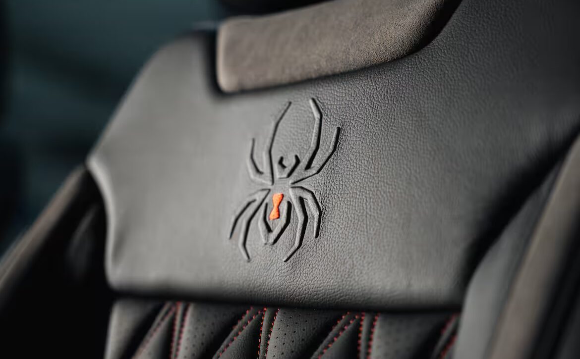 Style is finished to show-car standards straight from the builder. You get body-colour smooth fender flares, Black Widow custom hood vents, a grille replacement with painted accents, and a tailgate spoiler for an aggressive street profile. The factory bumpers and grille are paint-matched for a cohesive, premium look, while Black Widow exterior badging and a windshield header announce its pedigree without shouting. The cabin continues the theme with leather seat covers with red stitching, Black Widow custom-stitched headrests, red LED interior lighting, logo carpeted floor mats, and 50-state legal window tint for a calm, cool cockpit.